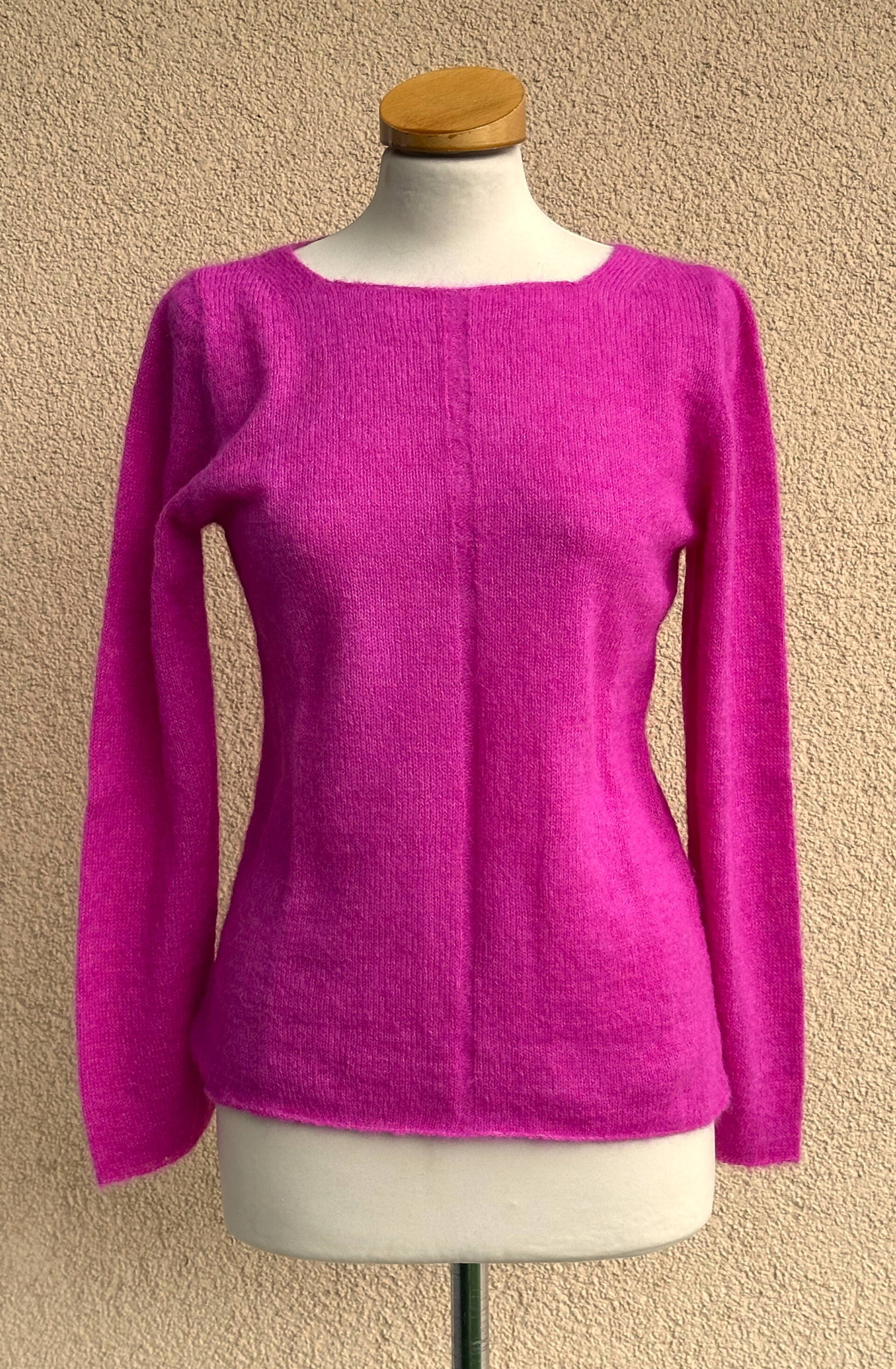 V-Ausschnitt, handgestrickt, Patentmuster vorne und am Ärmel